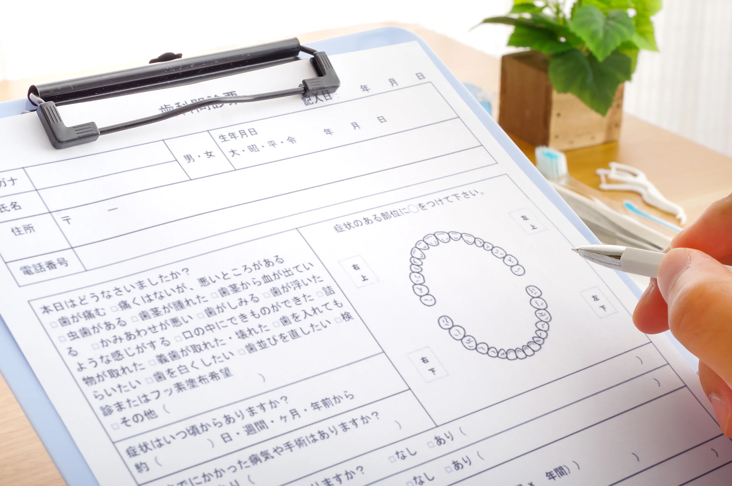 保険証をお預かりし、コピーを取らせていただきますので、その間に問診票のご記入をお願いいたします。